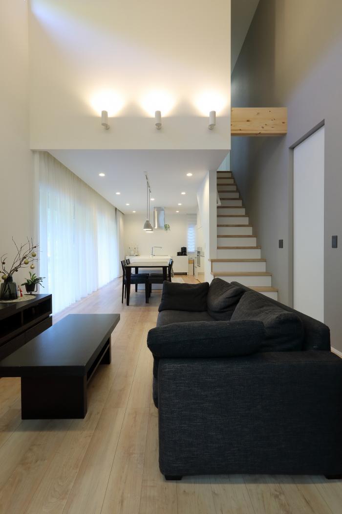 玄関ホールからの扉を開けると吹抜けで開放的なリビング空間