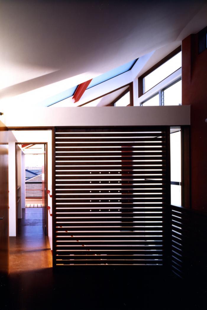 階段室の内観−2。3階納戸を見る。納戸の壁は目透かしの衝立てとし、全体はオープンスペースになっている