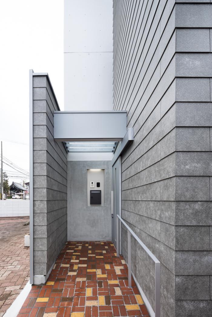 EV棟正面。診療所のアプローチに接続する袖壁裏のスロープ通路からEV棟に入る