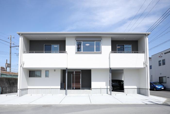当初は鉄骨を希望されていましたが、資材の高騰や、資材の不足等があり、木造に変更となりました。駐車スペースに立てた柱をアクセントとし外観をスッキリまとめました。