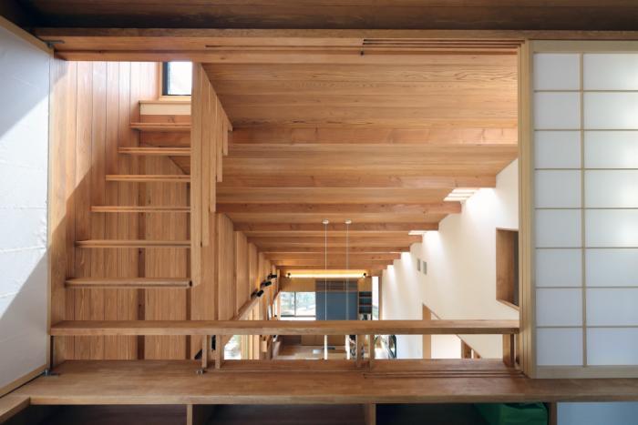 2階の書斎から吹抜けを望んだところ。左のタラップを上った先に月見台があります。