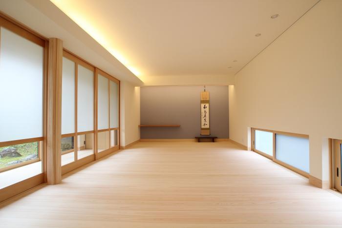 吊床形式の床の間を設けていますが、広縁とともにヒノキの無垢板を床材としています。
