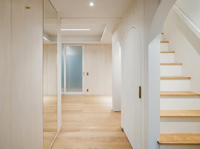 木壁には生活者のアクションが現れるように、アーチ状の開口が開けられています。向かって左側のくぼみにはソファが置かれます。木壁の間の居場所です。