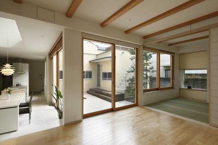 中庭には十分な日当たりを確保するような屋根の形をデザインし、屋根に太陽光パネルを設置することで、一年を通してエネルギー消費量がゼロになる創エネ住宅を実現しました。冬は1階の土間床に太陽光によるパッシブな蓄熱効果が期待できます。同時にヒートポンプ式蓄熱型床暖房を配置し、夜間電力で土間コンクリートに蓄熱された熱は一日を通して放出され、家全体の主暖房になっています  1階には、中心にダイニングとキッチンを配置し、キッチンから家中の家族の気配を感じることができます。 東側には、家族みんなが勉強やパソコンをするフリースペースをダイニングより40cmあげて配置しています。 洗面所・浴室は中庭に面して南側に配置し、朝日や夕日を感じながら緑が見える明るい空間で入浴ができます。