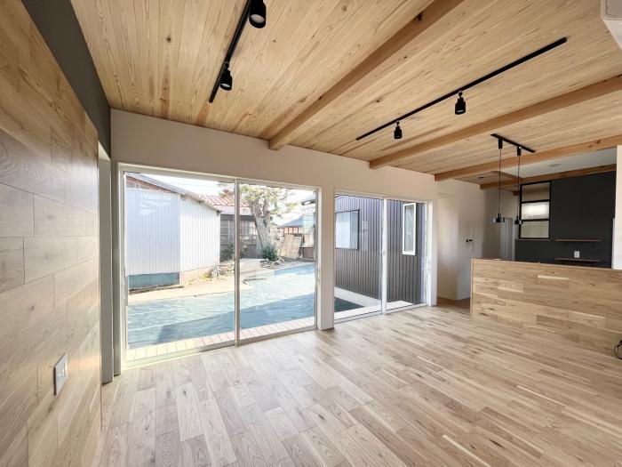 田園風景のなかの見通しの良い環境。敷地にゆとりがあるため夫婦寝室と家族で使う服収納を1階に計画し、BBQテラスを適度に囲うように配置。テラスは桧の濡れ縁と天井高さ2750mmの居間・食堂・厨房・洗面・食品庫とおおらかなにつながる。ウッドショックの影響を避けるために主な構造材に上越の杉を選び、さらに居間・食堂・洗面の天井材に採用した。建主家族と杉の伐採作業を見学させてもらい「あの山で育った木なんだよな...」と思える豊かさを感じている。内部建具と造作に既製品を多用し、価格調整に成功した。
