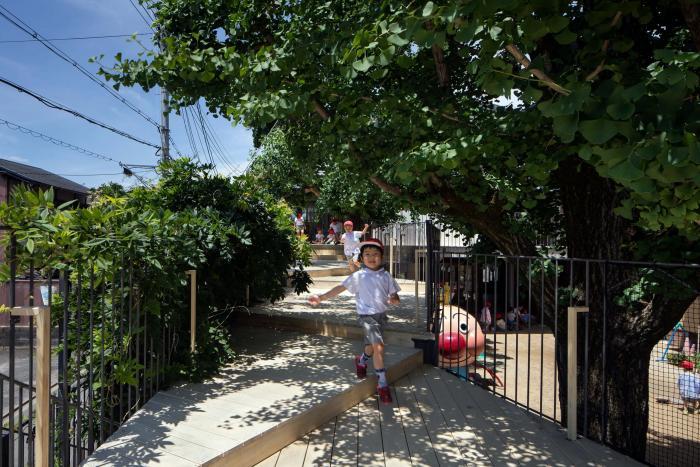 新園舎はそれら既存の礼拝堂とイチョウに連続し、取り囲むように計画しています。園舎は礼拝堂を参照し、外構フェンスは聖書にでてくる動植物をモチーフとして、デザインしています。園庭には広さに限りがあったので、園舎とひと続きのだんだんデッキを設けました。
