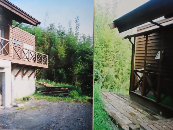 左側は木製(秋田杉)デッキの下より見上げる。右側は山側の階段をゆったりと枕木で施主の手づくりによる。