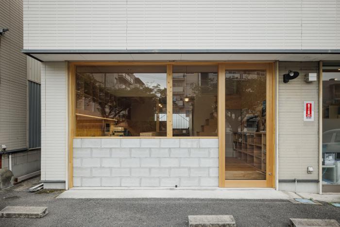 Studio REI の第2スタジオ。 テナントの一角。 通りから事務所の様子がうかがえるオープンなファサードは、無機質なコンクリートブロックに優しい無垢木材の温かみをプラス。 気軽に相談に立ち寄れる Café のような空間になればと… 室内のメインスペースは床に赤松の無垢フローリング。 壁はOSB合板を表しに…棚やデスクと併せて温かみのある内装に仕上げました。 どなたもお気軽にお立ち寄りください!