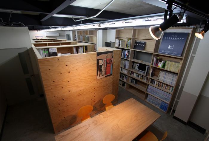 意匠面に於いては、既設の天井や床は撤去、鉄骨梁や床スラブを表しとし余計なものを排除し最大限の気積を確保、ホール感を引き出した。各ブースは構造用合板、収納棚はペルポック集成材と極力飾りっ気のない素材を使い機能美を追求した。