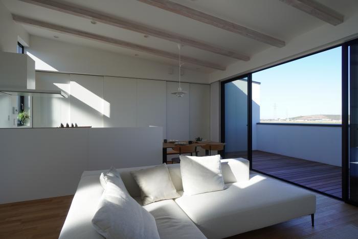 北側に面した2階のリビングには、大きな窓があり、そこから一面に広がる水田の風景をゆったりと見渡すことができます。四季折々に表情を変える田園の景色が、日々の暮らしにやさしい彩りを添えてくれます。リビングに隣接したテラスでは、穏やかな風を感じながら、自然とともに過ごすひとときが楽しめます。