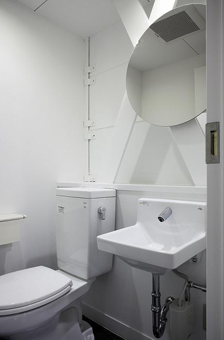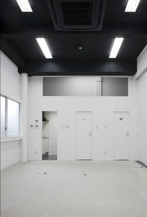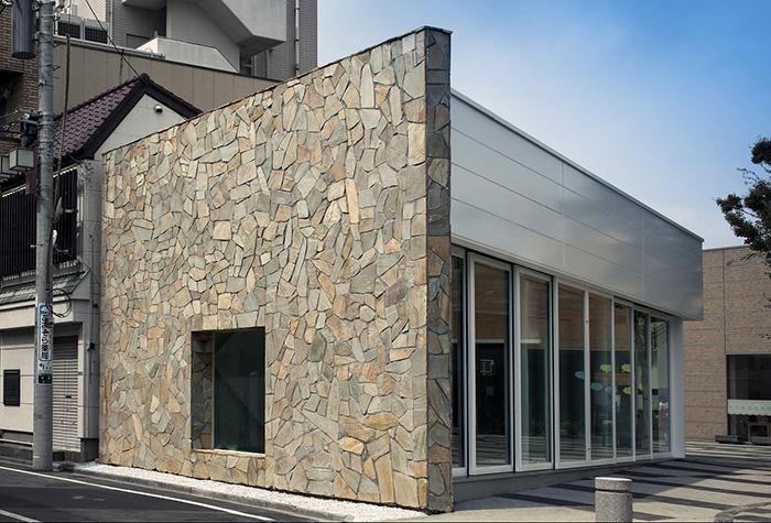 この建物の主要構造は鉄骨フレーム構造であるが、市道側の寡黙な表現を石貼りとしたことを契機に、その壁と更にそれに平行なピクトグラム「i」のある壁をRC造の耐力壁とした。更に、それらに直行方向の架構は鉄骨ブレースを付けることにより、それぞれ違う形式で水平力を分担した。