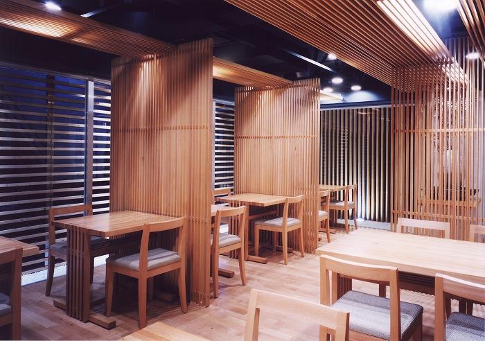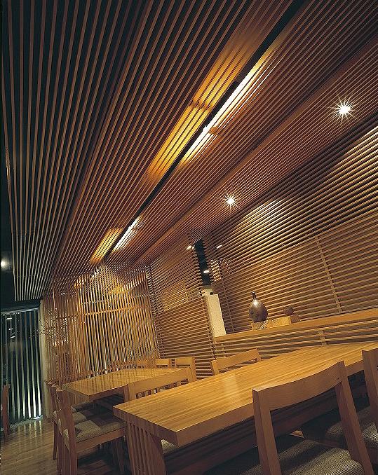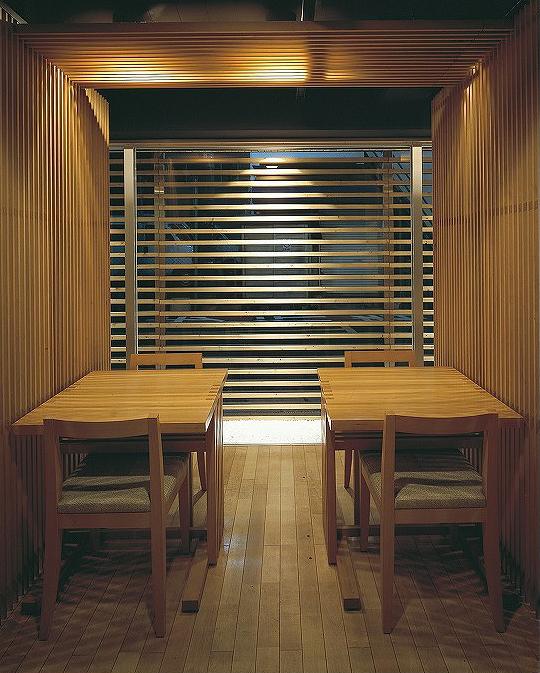 店舗全体を竪格子のみで構成すると、空間が単調となり、また、和風の印象が強くなり過ぎることから、竪格子と横格子を併せて 用いることとした。また、竪格子は同じ横格子に較べ遮蔽性を強く感じることから、国道沿いに竪格子、側道沿いに横格子を配した。 更に、店舗内部も格子で構成するものとし、スケール感に対応した細かな格子で竪・横を外部に合わせて配置した。 「格子の重層」を空間表現のベースと設定した。 また、内部格子の一部を可動とし、自由度の高い客席レイアウトを可能とした。テーブル脚部も格子の表現とし、空間構成に積極的に参加した。