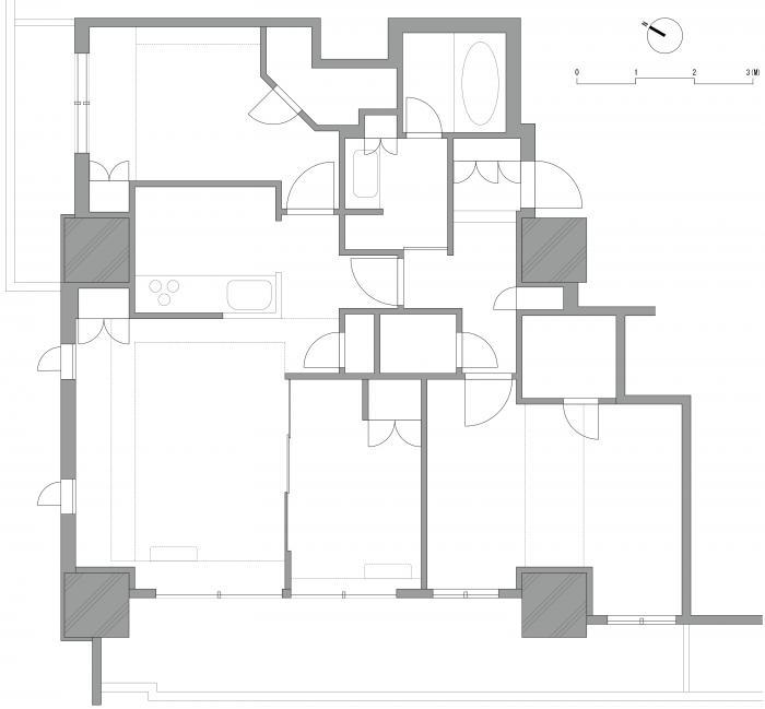 マンションの住戸の中に四畳半の茶室を設計した。施主は表千家で茶道に親しみ、自宅住み替えのタイミングで新たに取得した住戸を改修し、茶室を設えることにした。求められたのは、お茶会の開ける茶室で、「真・行・草」の設えで言うところの、「行」の設えでありつつ、比較的新しいマンションのインテリアとの調和である。
