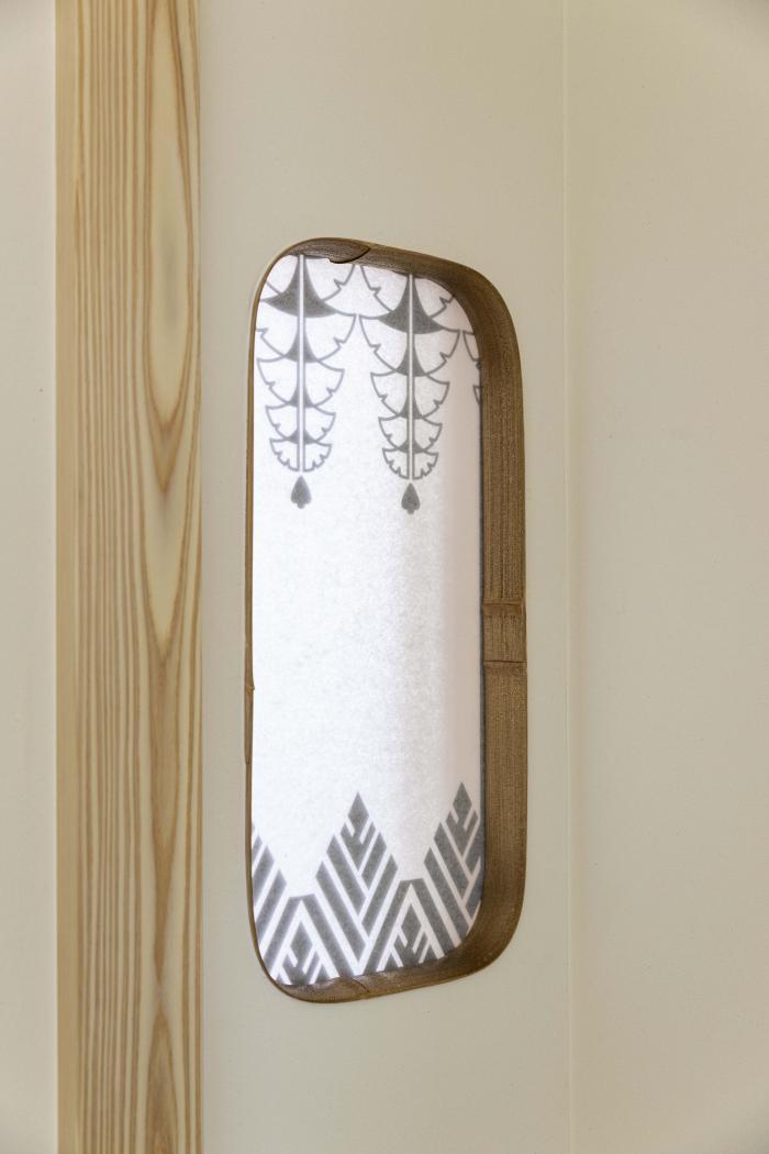 床の間の墨蹟窓。枠は竹の曲げ枠とし、障子のデザインはお施主様のお友達からのプレゼント。