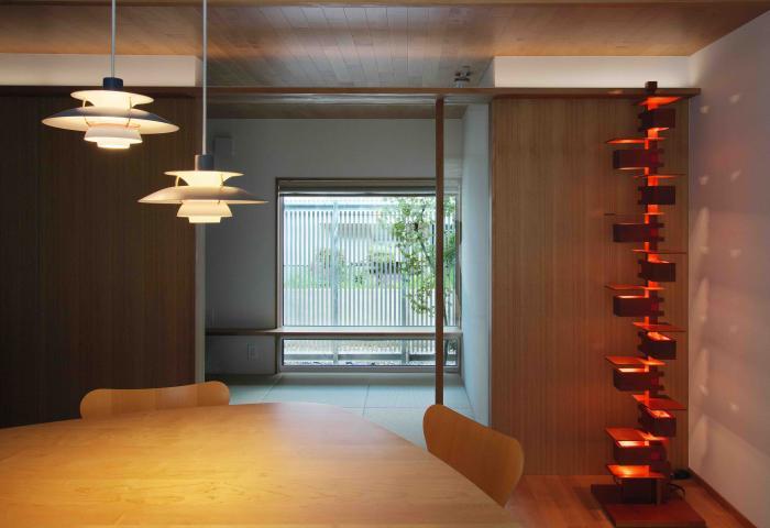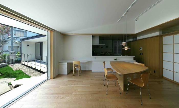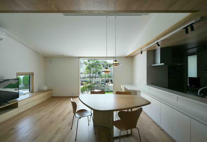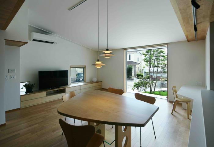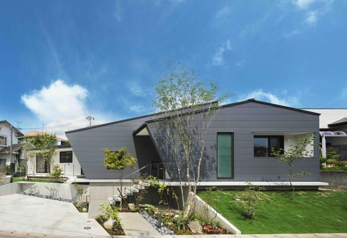 緩やかな段丘に造成された住宅街で、敷地内は道路面から約1メートルの高低差がある。外階段で上がる玄関と、庭側に蛇行するスロープの小径は勝手口へとアプローチする。丘に浮いたような外観。前面の道路沿いには芝張りの斜面や季節の花が咲く庭が道行く人の目を楽しませ、植えられた中高木は四季折々の表情で生活にも彩りを与えてくれる。また、住まいを街から完全に遮断することなく生活が見え隠れすることで住宅街が明るく開けた雰囲気となる。リビングを中心にそれぞれ個室が囲うように配した平家で、行き止まりのない回遊動線となっている。住宅内は片付けや収納が楽になるよう工夫した造作家具を適所に備えている。(ex:シュークローク、掃除用具収納、脱衣室とランドリーコーナー間収納)