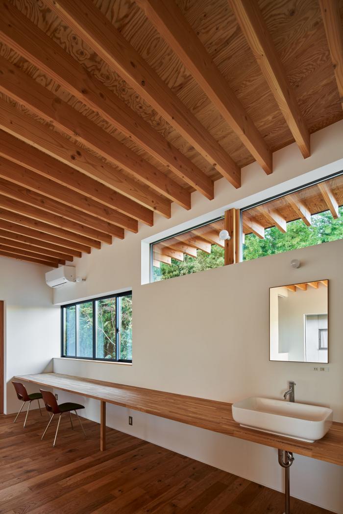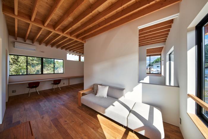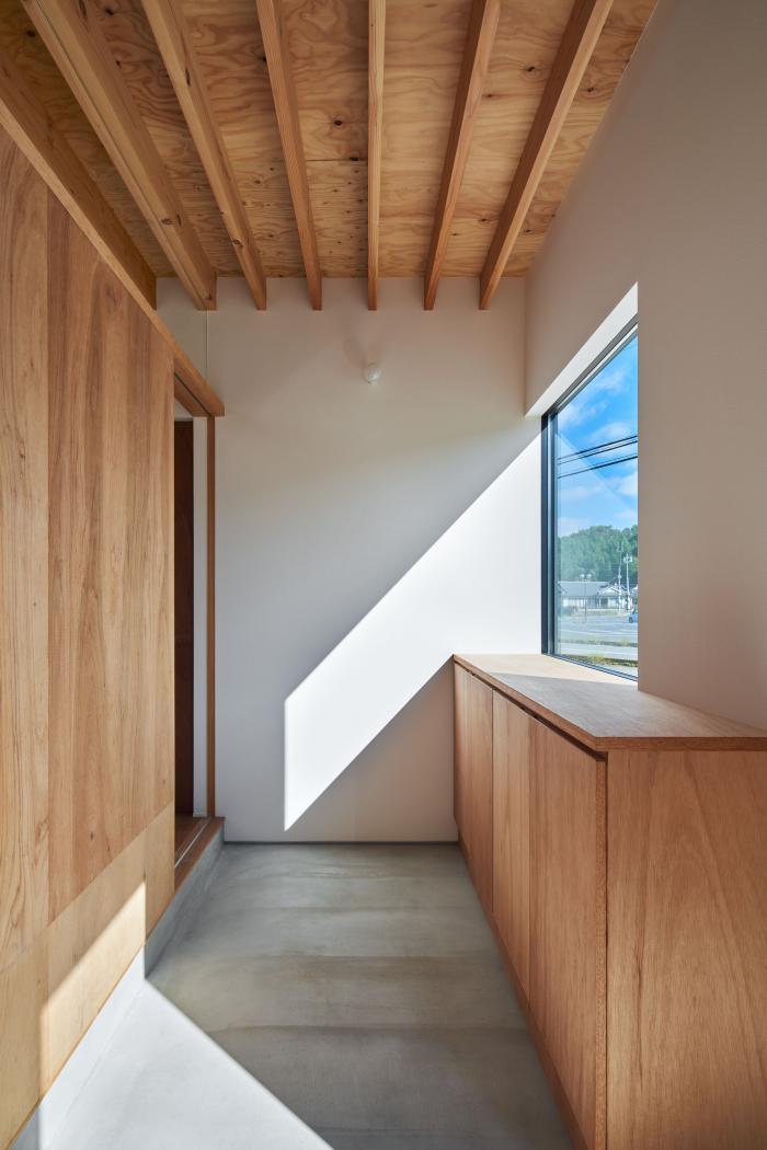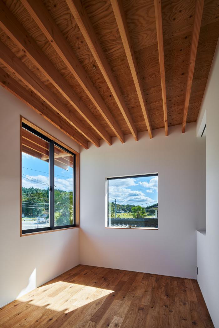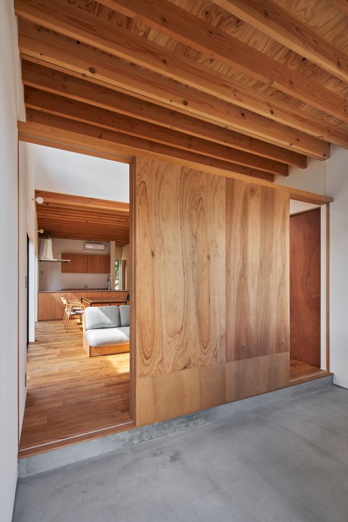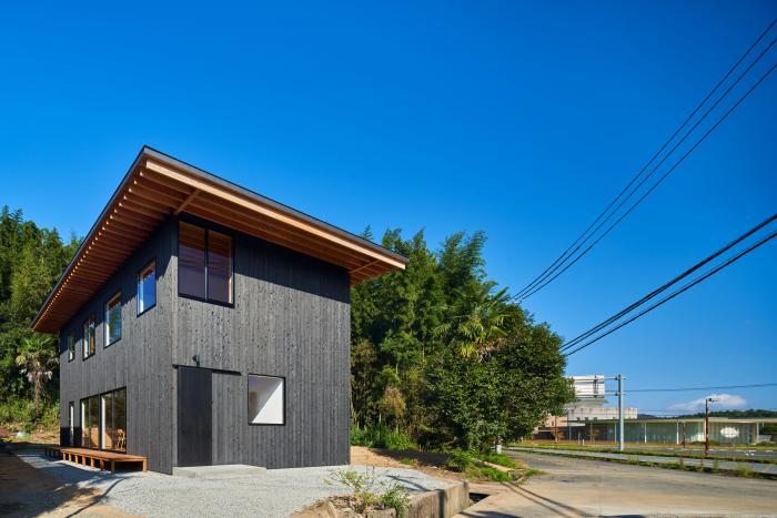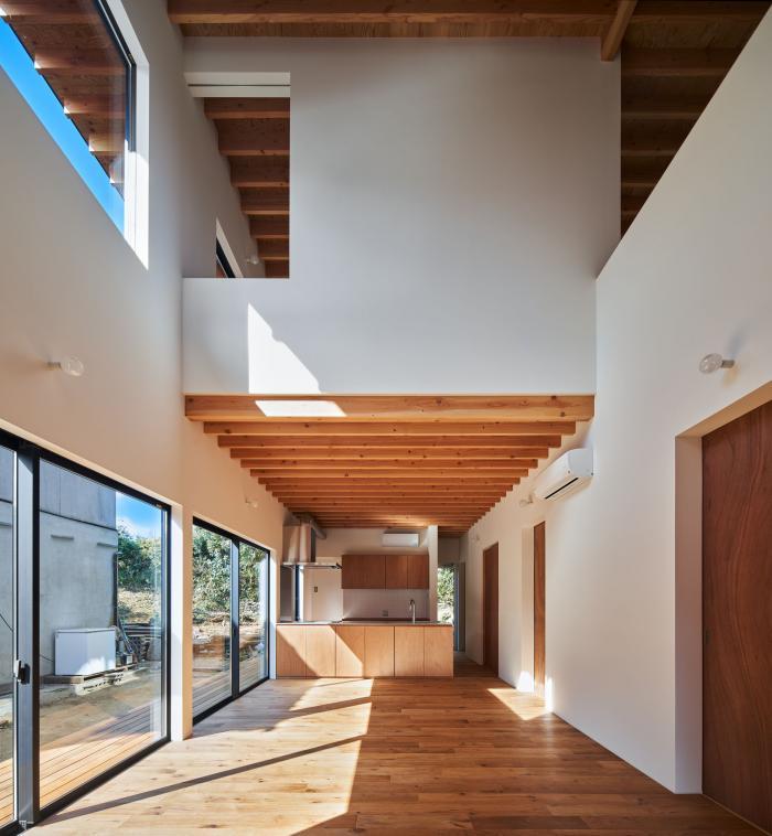 敷地は広島県三原市中心部から車で30分ほどの山間にある。東側はこの地域を南北に抜ける道路に面し、南側に祖母と両親が暮らす母屋、西・北側には竹林を背負う。離れて暮らす夫婦が、ご主人の生まれ育ったこの土地に戻り、祖母・両親と一緒に暮らすための2世帯住宅の計画である。施主からは「1世帯住宅の延長線上にある2世帯住宅」を求められた。2世帯住宅を設計する際には”世帯間の分け方”が課題となるが、家族の形態は10年、20年という時間単位の中で変化していく。その変化に対して包容力を持った器として機能する住宅を目指した。外観は、自然に囲まれたこの土地で周囲に呼応しながらも堂々とした建ち方とするために、生活空間を収めたボリュームの上に深い軒を持つ平らな大屋根を掛けたシンプルな形としている。内部は1階に家族共有のLDK・水廻りと親世帯の寝室を配置し、2階を子世帯のスペースとしている。家族の仲が良く、1階のLDKに全員が集まることが多いため、LDKを中心としながら吹抜や引戸の開閉により自分たちで全体に多様な繋がりを作ることが出来る構成とした。また、内外壁、天井高、吹抜、軒下空間などのエレメントを通常の住宅スケールよりも大きく用い、世帯間あるいは部屋と部屋の間で「共有」させることにより、一見すると単純な構成ながらも、どの部屋が何の用途なのか、2世帯住宅なのかどうかさえもはっきりとしない「不透明」な状態を作っている。ひとつひとつのエレメントのスケールを大きくすることで大らかさの中に距離感や拡がりが生まれ、エレメントを共有することで全体に繋がりが生まれている。ひとつの屋根の下で暮らす家族としてのまとまりを持ちながら、様々な変化に対してフレキシブルに対応出来る住宅となった。