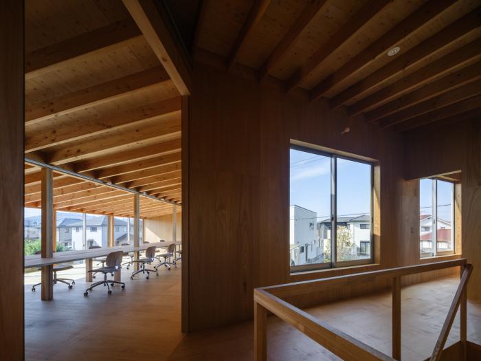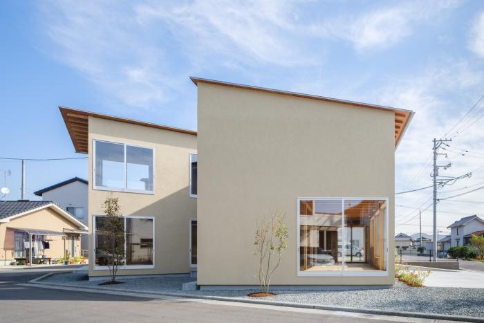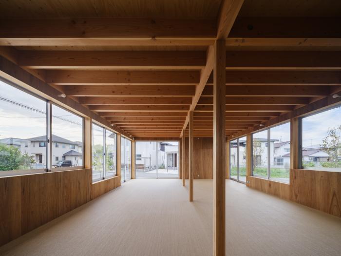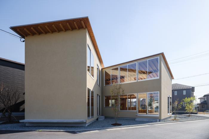 敷地は広島県福山市郊外の新興住宅地。周囲を個人住宅や集合住宅に囲まれ、東側以外の3面を道路に接する角地である。3方向道路という条件から、特徴的な開口部をもつ外観とすることで街との関係性を深め、福祉施設としての質を特徴付けることを考えた。建物は南棟を主機能として1階に機能訓練室、2階に事務室を割り当て、北棟は各階の関連機能を集約したシンプルな構成としている。敷地に対してひとつの大きなボリュームを配置するのではなく、分棟型とすることで各棟を周囲から逸脱しないスケールとし、くの字に曲げて接続することにより敷地の余白に奥行きを作りながら用途の強さを緩和している。構造架構についてもシンプルな掛け方とすることで、街と素直に向き合うことを意識している。南棟の立面を大きく占める開口部は、機能として彩光や通風を積極的に取り込みつつ、季節や時間と共に内外の距離感を変化させ、それぞれが異なる窓辺を構成している。リズミカルに大きさを変えて並ぶ連続窓は、リハビリにおいても視覚的な刺激を与える役割を担う。一方で、外から見ると、機能の枠を超えた大きな窓を構成し、この施設の目指しているオープンな活動を形として表現する立面となることを意識している。住宅地への福祉施設の挿入という課題に対し、機能やディテールが街と連動することで特徴的な福祉環境を生み出しながら地域を明るく照らす顔となる建築が出来上がった。