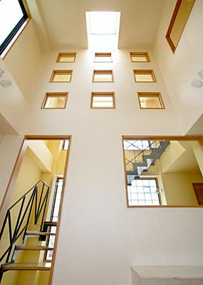 当初、1Fで考えられていたご自宅部分を最上階にメゾネットで計画しており、隣地が建て替えをした後も採光を確保できる様にトップライトやガラスブロックで明るさを確保できる様に設計しております。