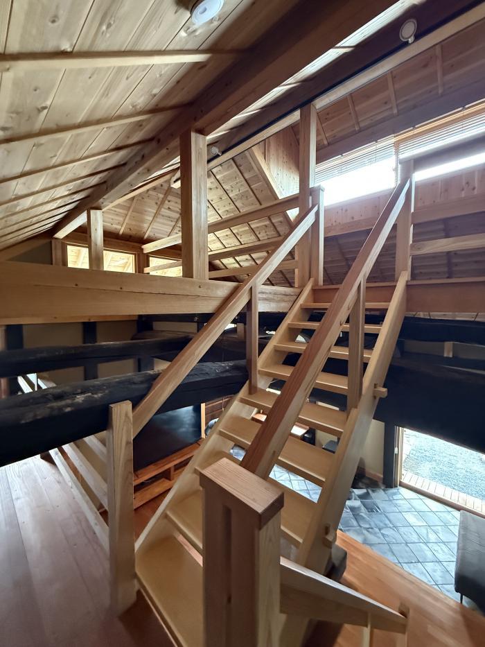 古材の太い牛梁と根曲の梁が力強く屋根を支えている。