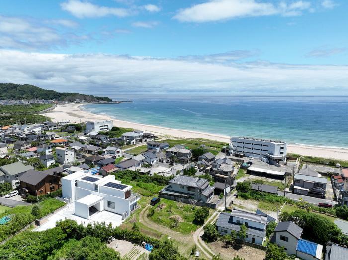 海辺の住宅地にありながら、日常を離れた滞在の時間をもたらす別荘。建物は水平に広がる構成とし、複数のテラスと水盤を介して内外がゆるやかにつながります。各室は外へとにじみ出るように配置され、光や風、海の気配を深く取り込む計画としました。周囲に開きながらも視線を丁寧にコントロールし、プライバシーと開放性を両立。夕景には灯りと水面が呼応し、滞在するように過ごす豊かな時間を生み出します。
