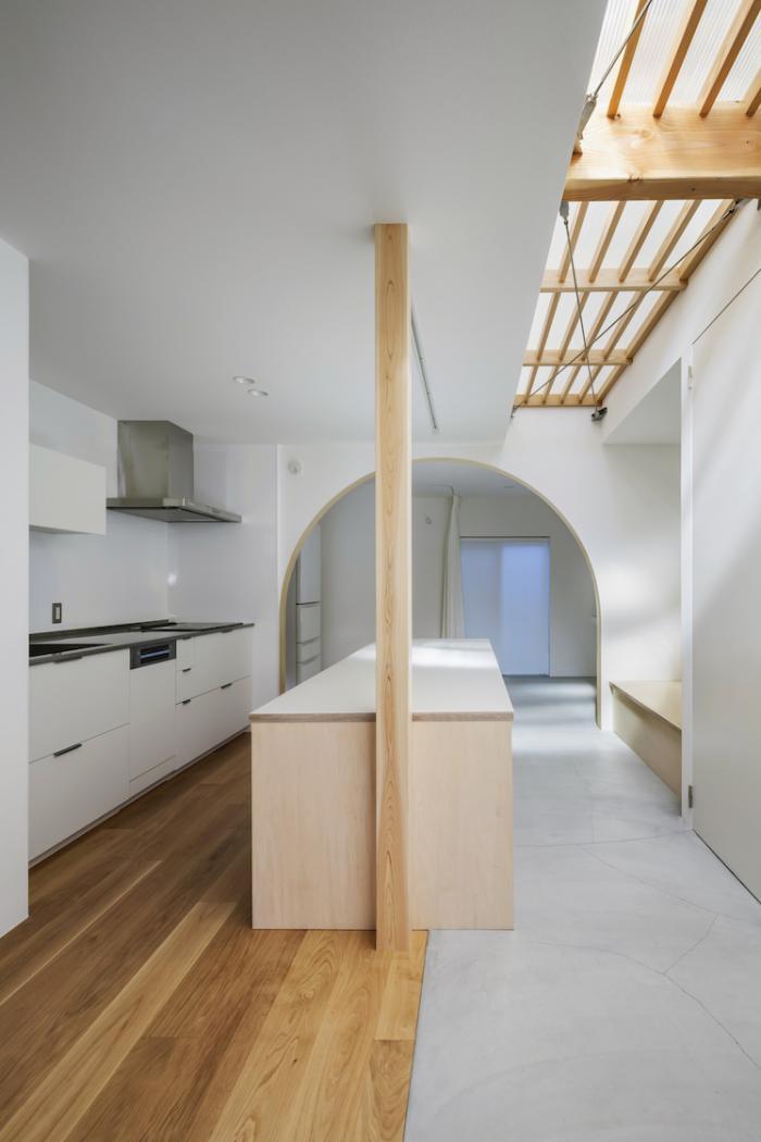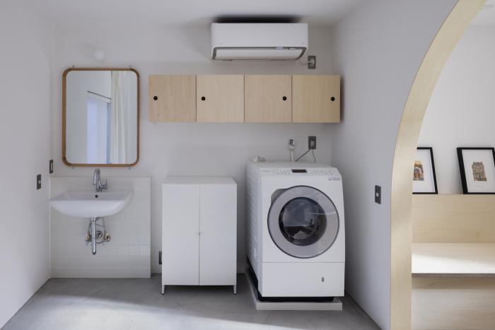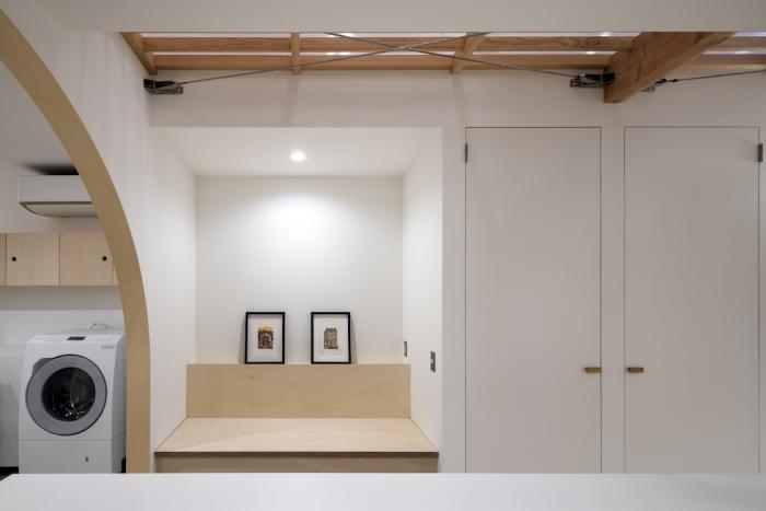 ワンルーム構成である1階全体は、単調で間延びした印象とならないよう、アール垂れ壁や仕上げの切替えで緩やかにゾーン分けを行い、また機能や居場所を散りばめることで拠り所のある空間となるよう企図した。