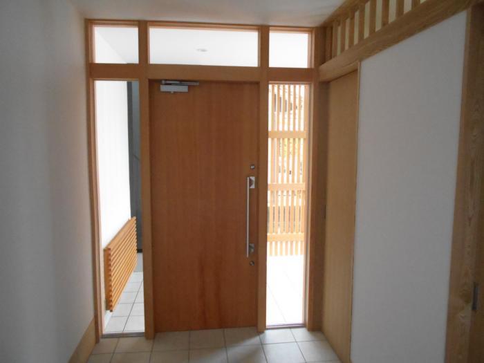 ポーチから玄関に入る。正面には地窓の障子が階段の足元を明るくする、自然光が入る昼行燈、