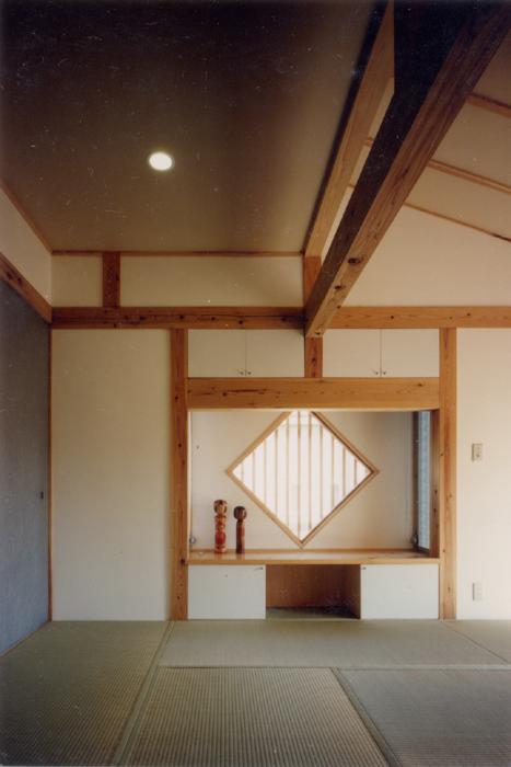 OMソーラーシステムを導入した家です。オーソドックスな軸組み構造で、ほとんどの部屋で柱と梁を現しています。さらに内部の仕上げは紙と木と漆喰を中心にしたいわゆる健康住宅です。2階の子供部屋では、将来的に子供が巣立った後に間仕切り壁を簡単に撤去やすいように、あえてシナ合板をビス現しで留めています。