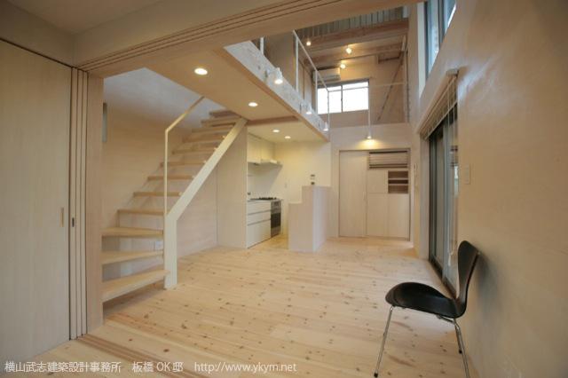 3世代4人家族が住む、延床面積約60m2の小さな住宅。木造2階建て+ロフトの構成。大きな吹抜のある家族室を中心に左右に個室が並ぶ。吹抜はロフトの天井レベルまであり、最大高さは6mを超える気積を持つ。各部屋の間仕切りは、引込戸となり、開放時は建具自体が完全に収納され、建物全体が吹き抜けを通して一体的に繋がるようなっている。就寝時以外は、各自の個室の扉を開放することにより、小さいながらも広々とした空間になるようにしている。