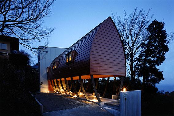 西熱海の陶芸工房のある家.家の機能のほとんどを2階に計画する事により,全ての部屋からの熱海市街の眺望,相模湾の眺望が可能になり、結果平屋と同じ様に機能性も向上します.熱海の海を愛する建築主から「船」をイメージする形態となっています.