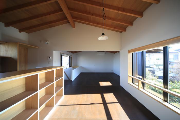 2階の居間からは、北側の畑を介し桜の大木を望むことができ、春には花見ができるように開口を配しました。