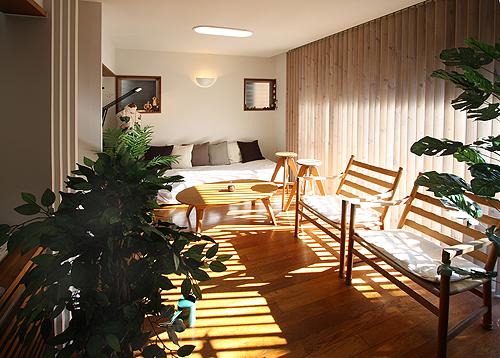 この居間はいつもかたずいているフォーマルな部屋としての性格をもたせています。前庭を眺めながら静かに考えに耽る場として または、来客用のスペースとして使われています。そのため、敢えて中庭には面していませんが、南の前庭からの光は十分注がれています。