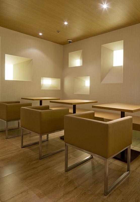 そこで、ナナズグリーンティー上海香港名店街店では、壁、床、天井、机、椅子、ベンチを1つの素材で作り、「木の茶室」「土の茶室」「石の茶室」の3つの茶室を表現する。