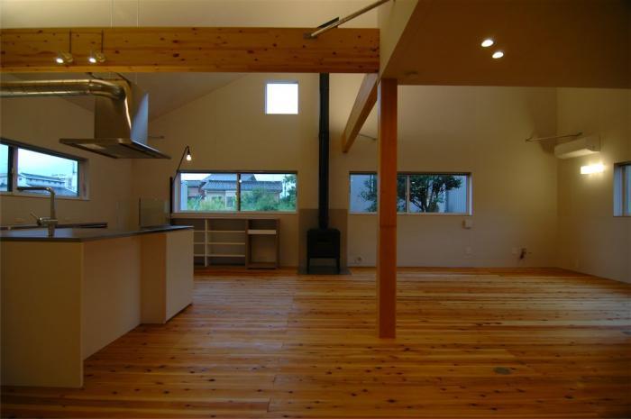 この住まいの断面構成がよくわかる写真。収納や客間を兼ねるロフト部分の天井高さを確保するために、全体の大屋根は中折れ式の片流れ屋根になっています。