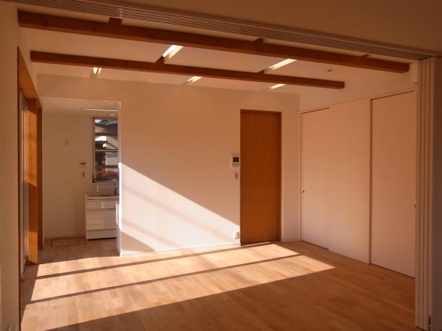 親世帯のリビング・ダイニングです。右の木の扉の向こうが玄関ホール、左奥がキッチンです。梁をあらわしにするなどして、子世帯より若干木の感じを強く出してみました。