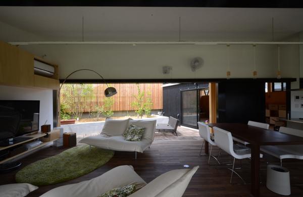 中央のメインのLDK棟の南北は建具によって大きく開放され、緑の庭とデッキの庭という2つの大きな庭と一体化し、様々なアクティビティを誘発しています。
