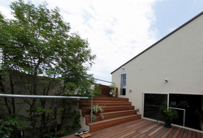 西側段々のウッドデッキテラス。壁に囲まれているのでプライバシーが保てます。ここを介して建物は行き止まりなくぐるぐる回遊できます。