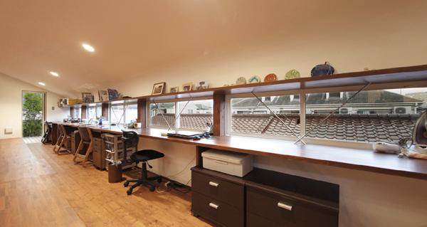 ファミリーライブラリー東より。細長い大きな机の前から隣家の家並が見えます。奥のガラスサッシからウッドデッキテラスに出られます。シンボルツリーの緑の景が飛び込んできます。
