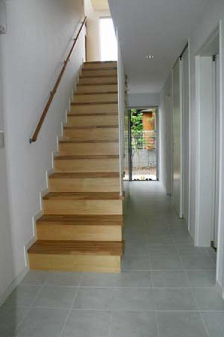 見晴らしの良い2階にリビング・ダイニング、1階に書斎とプライベートスペースを真ん中に配した廊下と階段でつなぐプランになっています。内玄関から1階室内すべての段差を無くしているため、玄関扉を開けて入ると上がり框の無い白いタイル貼りの玄関廊下がまっすぐに伸び南側の庭へと続いています。