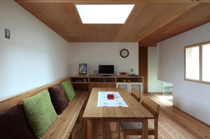 トップライトから柔らかな光が降り注ぎます。コンパクトでシンプルなリビングです。ベンチからは中庭を眺めることが出来ます。