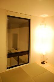 中庭からのカットてす。正面は現代的なデザインの和室です。左の開口は中庭を介して、1階に陽を室内に採り入れる為に開けられています。