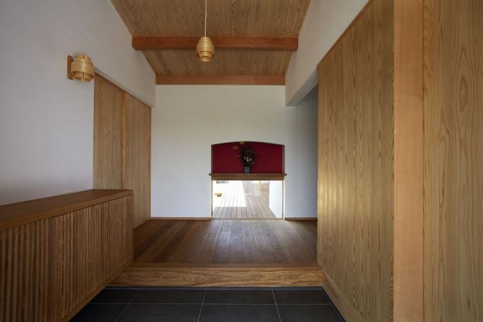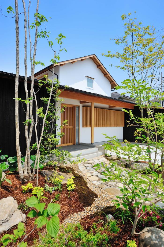 周辺の環境に馴染むよう,木造2階建ての建物は高さを抑え調和を感じさせるよう心がけました.玄関にあるのは深い軒下空間.建物には伝統的な木造建築の構成を取り入れており,和の趣を感じさせてくれます.