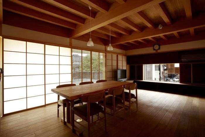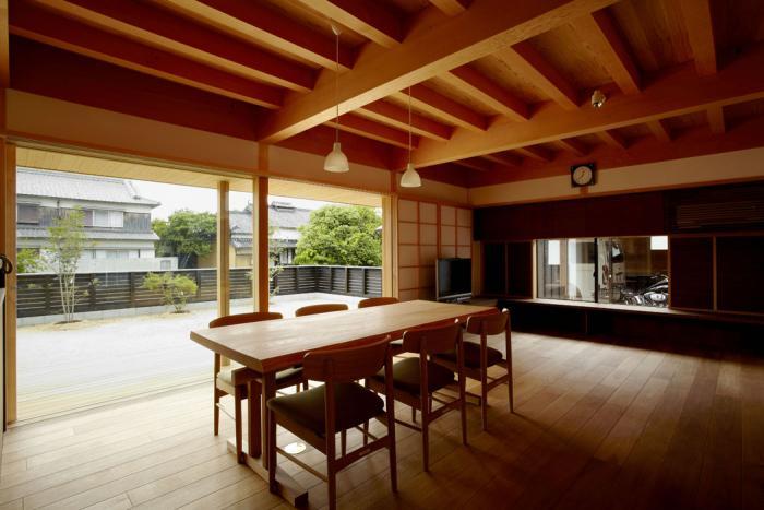 リビングからウッドデッキへと繋がる大きな開口部には夏障子を設けており,風通しや視線等,障子と合わせて様々なシーンに調整できます.離れのバイクを眺めるための座卓越しに窓も配置,ダイニングからもキッチンからも視線は通ります.