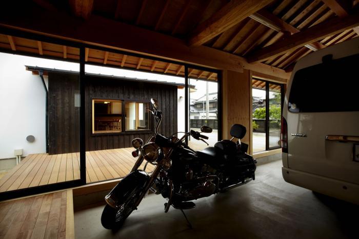 ただ車やバイクを停めるだけの場所に留まりません.リビングルームと同様,デッキに接する部分には大きなガラス窓があり,外からの光を取り込むことができます.