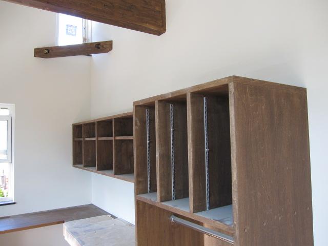 無落雪屋根が好きではないとのことで、それに代わる屋根材を提案、無落雪屋根認定のコロナルーフを採用し、切り妻屋根にしました。それにより、切妻の小屋裏を利用し、2階の4部屋すべてにロフトを設け、出来るだけ収納スペースを確保しました。また、キッチンは、オリジナルキッチンの対面にし、階段は、LDKの中の南面に設け、人の気配を感じるようにしています。