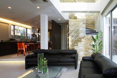 カーブ状の流れるような塀は、色や形状、質感によって周辺に対する威圧感を抑え、優雅に敷地全体を包み込んでいる。石や珪藻土、木(ウッドスクリーン、備え付け家具)等の自然素材を取り込み生かすことで、内外供シンプルな中に、優しさと緊張感のある豊かな内部空間を醸し出し、ダイニングキッチンと一体のリビングは、吹抜けやテラスによって、より明るく開放的なものになっている。