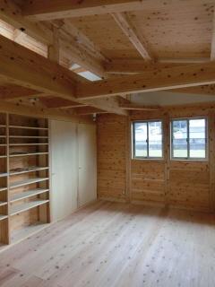 床:杉板蜜蝋ワックス仕上げ 壁:珪藻土塗り 天井:屋根下地杉板見出し