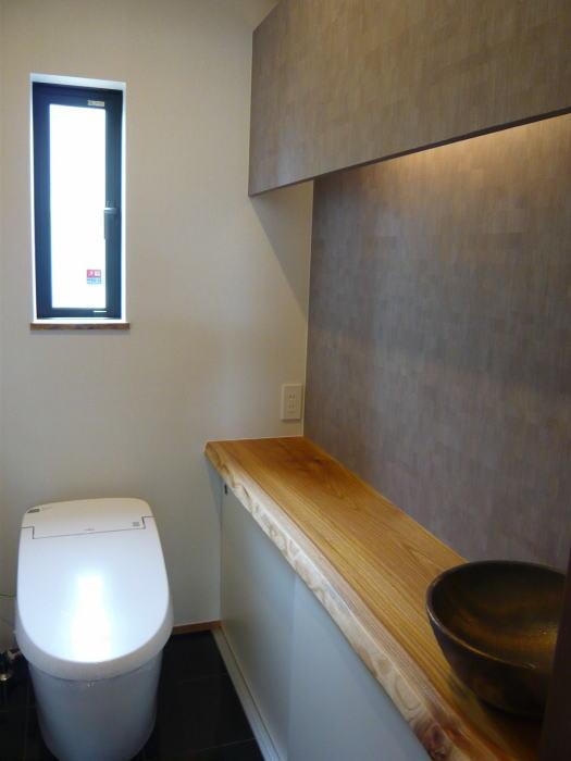 無垢材のカウンターの上に陶器の手洗い器は施主支給でこだわりです。間接照明でインテリアデザインしました。