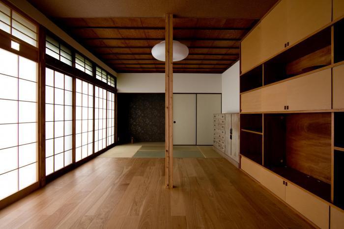 昭和30年代に建てられた木造2階建ての住宅の改修です。元々、和室とリビングであった二つの部屋を一つの部屋にした居間です。天井は当時のまま、柱も化粧せずあえて埋木でシンプルに、また建築当時から使われている木製建具を利活用することで、これまでの生活の記憶といったものを随所に織り込みました。