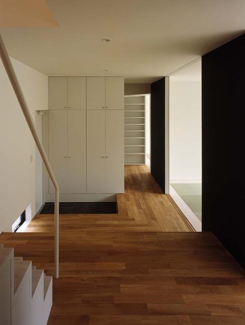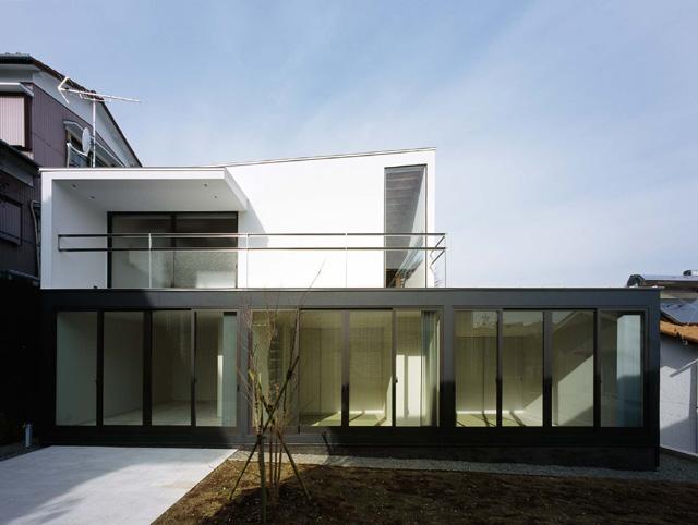 雛壇状に造成された住宅地に建つ、混構造の住宅です。隣地からの悪影響を受けないように1階の西側部分を鉄筋コンクリート壁とし、その他は木造の軸組みによる構造としています。1階の平面は、隣接する周囲の住宅に倣った形で、北側の前面道路側に入口を設け、南側の庭に面して居室を並べていますが、開口は東西面には全く無く、南面は逆に全面開口として、平面の性格を強調したものとしています。一方2階は、内部に柱が無い7m×7mの大きな1室空間を設けて、居間と台所を兼ねた生活の主要な場所となるような部屋とし、南側にバルコニーを設けるために、そのヴォリュームは北側に跳ね出した形となっています。