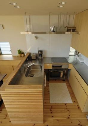 このガレージは本業であるコーテングの作業場としても活躍します。外部にもクルマ1台・自転車3台を置くスペースを確保、敷地を有効に使う工夫がされています。住宅密集地の中にあるため、環境の良い2階にリビングを配置、さらに吹抜けを設けて採光と通風を得る工夫をしています。